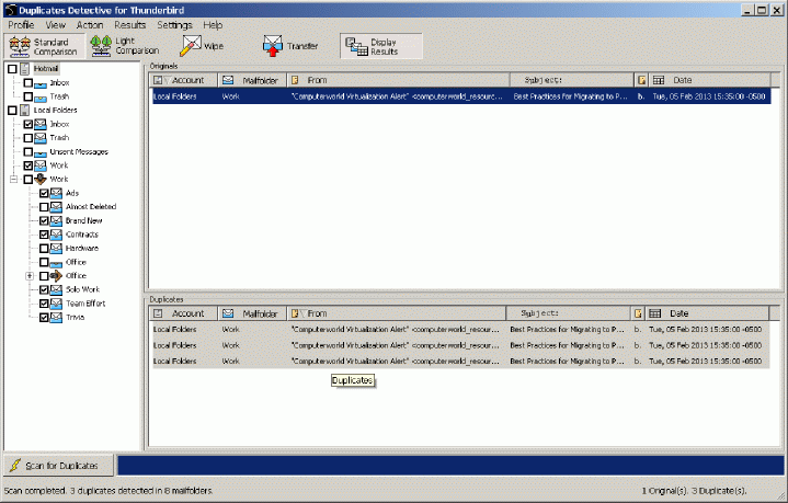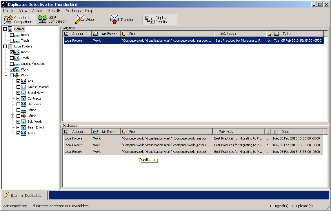 actions on duplicates: Transfer (to another mailfolder), Wipe (delete